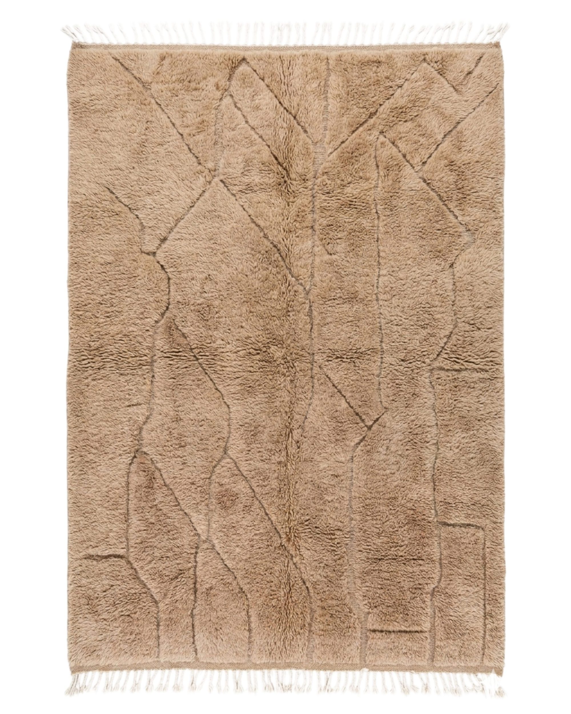 Ce tapis Mrirt se distingue par une écriture organique et apaisante, où les lignes semblent se dessiner naturellement dans la matière. Ses motifs, à la fois libres et structurés, évoquent un paysage minéral, presque sculpté dans la laine.