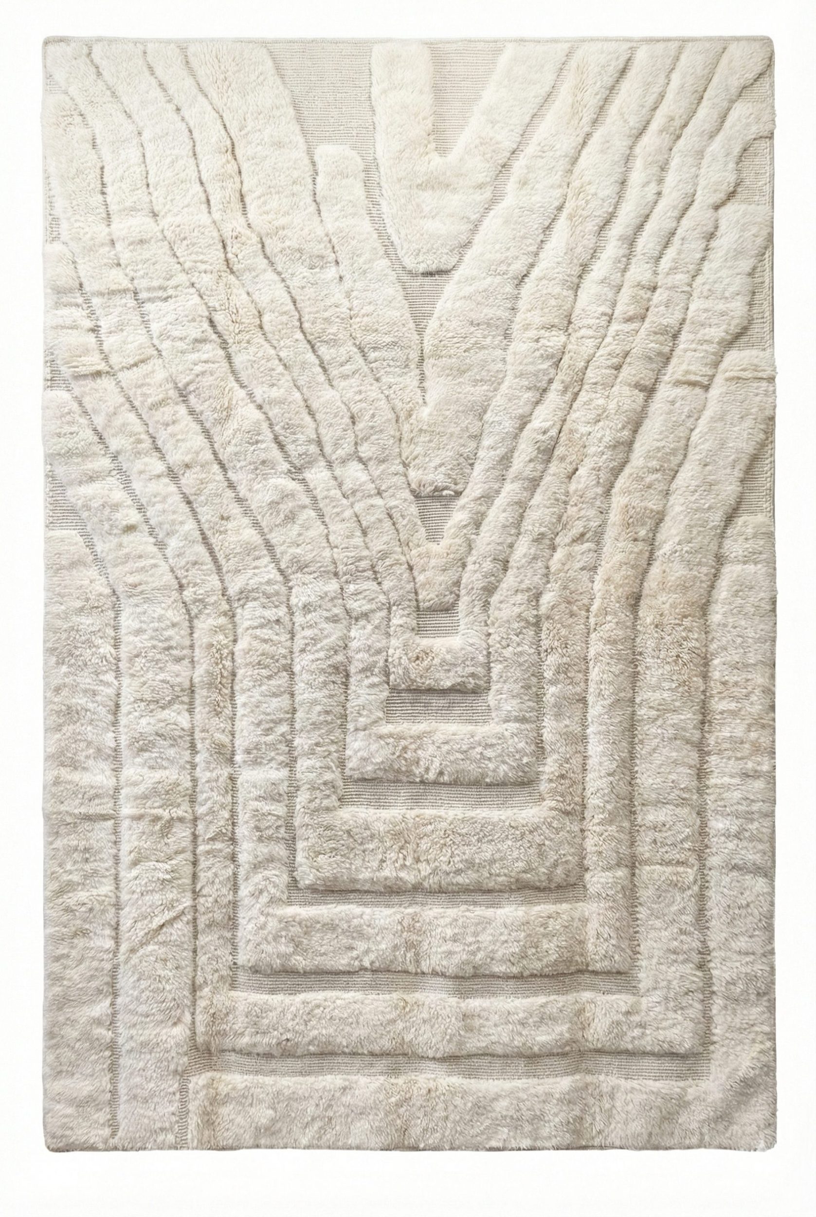 Pour inaugurer notre rendez-vous mensuel autour des tapis berbères en pièces uniques, non reproductibles, choisis pour leur force émotionnelle autant que pour leur perfection artisanale, nous avons souhaité revenir à l’essentiel : un tapis Mrirt d’une densité exceptionnelle, qui raconte l’origine et le geste pur.
